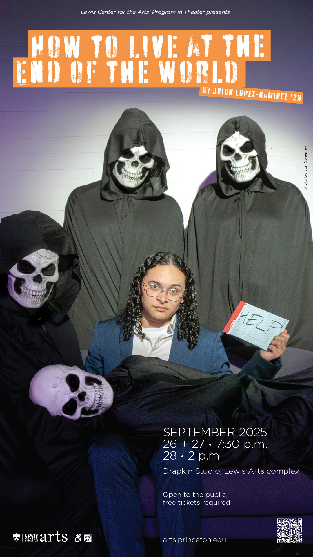 Student writer and director Orion Lopez-Ramirez came prepared with a simple concept and some store bought costumes to produce this poster combining dread and whimsy for his original production, How to Live at the End of the World.